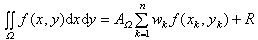 式中对于不同的积分区域Ω选取不同的常数,是求积系数,R是余项.