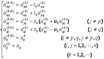 因为在这种旋转变换下,消去了矩阵中位于第p行第q列(p¹q)交点上的元素(见本节,五),而矩阵所有元素的平方和保持不变,而且对角线上的元素的平方和增大,因而非对角线元素的平方和随之减小,因此,当旋转次数足够大时,可使非对角线元素的绝对值足够小.对于预先给定的精度e>0,如果|aij|<e(i¹j),则可认为aij≈0.于是得到求矩阵A的特征值与特征矢量的具体迭代方法.