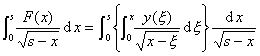 的沃尔泰拉积分方程称为阿贝耳积分方程。对给定函数F(x)适当加以限制下,积分方程(1)可用间接方法求解。(1)式除以s是一参数),然后两边积分,得