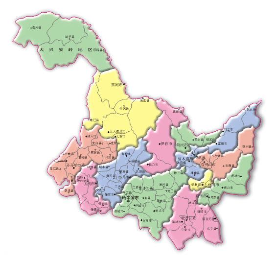 The Heilongjiang Province area more than 460,000 square kilometers, the entire province governs 1 local, 12 places levels city, 64 municipal districts, 19 county level cities, 46 counties, 1 autonomous county. Namely: 475 towns, 469 townships (59 ethnic townships), 318 subdistrict offices, the provincial capital is Harbin.