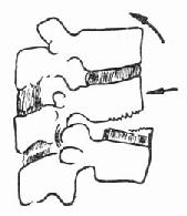 (二)旋转损伤 X线检查可见一个椎体在另一个椎体上旋转(图73-2)。有时可见椎间隙变窄,主要为纤维环及髓核损伤。下一个椎体的前缘上角,可被纤维环撕脱一小片,但椎体高度不变。少数仅有单纯椎间隙变窄,无纤维环撕脱。