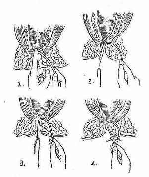 (三)挂线疗法 适用高位单纯性肛瘘,即内口在肛管直肠环平面上方,手术切断可引起肛门失禁。采用瘘管挂线,使要扎断的括约肌与四周组织先产生粘连,因结扎后局部缺血、坏死,经10~14天后自行断裂,此时不发生收缩失禁,瘘管敝开成创面,达到逐渐愈合。方法:将探针从外口经瘘管在内口穿出,探针引导一无菌粗丝线或橡皮筋,将此线从内口经瘘管而在外口引出(图2-106),然后扎紧丝线。挂线时须注意:①找到内口的确切位置,不可造成假道,免手术失败;②收紧丝线或橡皮筋前,要切开皮肤及括约肌皮下部,以减轻术后疼痛,缩短脱线日期;③结扎要适当收紧,过松不易勒断瘘管。术后热水坐浴,经3~5天再拉紧一次,一般在2周可完全断裂。