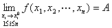 [n重极限与累极限]  上述函数f(x1,,xn)的极限,是当函数的一切自变量同时趋向于各自的极限时所得出的,称为n重极限(在n=2,时分别称为二重极限,三重极限,等等).此外,还有一种极限,它是由各个自变量依某种次序相继地各自趋向于极限所得出的,称为累极限.例如对二元函数f(x,y)来说,二重极限为,两个累极限为(先让自变量x趋于a,再让自变量y趋于b)和(先让自变量y趋于b,再让自变量x趋于a),三者不一定相等.