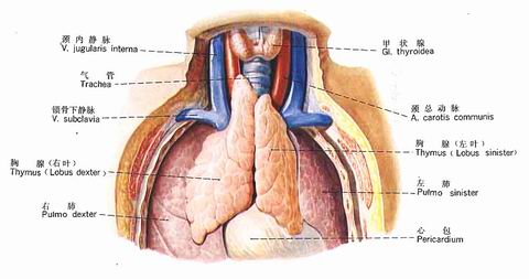 甲状腺位于喉和气管的两侧,甲状腺峡位于第2~4气管软骨环的前方。吞咽时可随喉上下移动。
