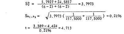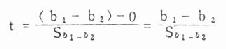 根据数理统计的理论,同一批资料计算所得tr与tb是相同的,即tr=tb。处理资料时可检验相关显著性代替其回归显著性。 由于例9.1资料的r在α=0.01水准上显著,故可判断样本回归系数-8.5045与0的相差有显著性,说明存在凝血时间随凝血酶浓度变化而变化的回归关系。 (二)两样本回归系数相差的假设检验 若有两个可以比较的样本,它们的回归系数分别为b1与b2,经检验都为显著,回归系数的标准误分别为Sb1和Sb2。b1与b2相差的显著性也可用t检验法检验,其计算公式为: