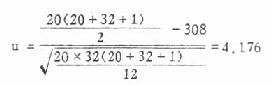 三、两组等级资料的比较等级资料又称为半计量资料,当两组等级资料比较时,用秩和检验来比较其相差是否显着比用χ2检验要恰当。两组等级资料,通常例数都较多,故一般都用计算法,其步骤与两组资料的秩和检验相似,不同的是要求各等级的平均秩号,为此,先要求得各等级的秩号范围。今举例10.5说明之。 1.求各等级的平均秩号。为此,先要求出各等级的秩号范围,如等级“-”共18+8=26例,共秩号范围自1~26。要注意的是各等级的秩号范围必须紧相联接。最后一组秩号范围的上限一定等于两组例数之和。求得各等级秩号范围后,再求其下限和上限的平均,即可算得平均秩号,如等级“一”的平均秩号为(1+26)/2=13.5。余类推。 2.求出R及其n1,为计算方便,把例数少的正常人组的秩号之和作为R其例数为n1得R=308,n1=20,n1=32 3.代入式(10.7)得u值,即可作结论。 例10.5,今有20名正常人和32名铅作业工人尿棕色素定性检查结果如下表10.5,试问其相差是否显著? 表10.5 20名正常人和32名铅作业工人尿棕色素定性检查结果