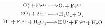 五、铁离子在组织无氧缺血时的破坏作用 上面提到缺血组织中,过氧化游离基含量过多,通过它的促发作用,引起铁离子催化的Haber-Weiss反应,产生反应力极强的氢氧基。