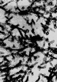 图18-33 曲菌病 曲菌菌丝粗细均匀,有隔,呈锐角分枝 支气管和肺的曲菌病表现为支气管炎或支气管肺炎。在支气管粘膜或肺组织引起小脓肿形成和肺梗死。曲菌常在肺组织原有的空洞性病变,如肺结核空洞、支气管囊性扩张或肺脓肿等的空腔内繁殖。大量菌丝形成团块,称为曲菌球。一般为发生在上叶或下叶尖段。曲菌球逐渐增大,并可在空腔内移动,可引起咯痰和反复咯血。 还有一种过敏性支气管肺曲菌病。临床表现类似支气管哮喘,痰粘稠,痰液内可分离出曲菌。血及痰内嗜酸性粒细胞增多。血清IgE增高,并有抗曲菌抗原的沉淀抗体。发病机制可能与曲菌抗原引起变态反应,使支气管痉挛、分泌亢进有关。主要病变为近端小支气管破坏,引起中心性或近端支气管扩张。晚期造成肺组织纤维化。过去认为这种过敏性支气管肺曲菌病很少见,但近年来发现在接触大量曲菌孢子的人员中并不少见,并逐渐增多,值得注意。此病早期治疗可以恢复,可防止发展到晚期引起严重的支气管扩张和肺纤维化。 鼻窦的曲菌病可直接蔓延到眼眶和脑及脑膜。脑及脑膜的曲菌病也可由血源播散而来。曲菌易侵犯血管,引起小动脉和静脉坏死性脉管炎。当病人抵抗力低下时,可引起血源播散到心肌、脑、肾、消化道、肝、脾等器官,形成小脓肿和肉芽肿性病变。曲菌性心内膜炎可在心房或心室内膜及瓣膜上形成大的赘生物。消化道曲菌病多发生在小肠、胃、食管和舌,其粘膜表面坏死,形成溃疡。
