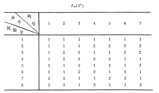 正交表的符号为,其中表示正交表;下标是正交表的行数,表示试验次数;是正交表的列数,表示试验至多可以安排的因素个数;是表中不同数字的个数,表示每个因素的水平数。例如,8表示正交表中有8行,即安排试验的次数为8次;7表示正交表中有7列,试验至多可安排7个因素(包括交互作用的因素);2表示每个因素只有两个水平。这种正交表称为2水平型的正交表。