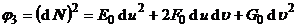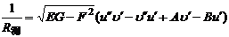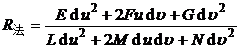 ds2=Edx22fdxdy+Gdy2 式中 E=1+ F= G=1+ ds为点M(x,y,z)处的弧的微分,ds2称为第一基本二次型,E,F,G称为第一基本量 ds2= 式中 E= F= G= 第一基本量E,F,G都在点M处取值. 曲面上每点(奇点除外)的第一基本二次型是正定的,即 E>0,G>0,EG-F2>0 |