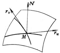 [法线单位矢量] 通过曲面上一的M所有曲面曲线(即该曲面上的曲线),在点M的切线落在同一平面上(奇点除外),称这平面为曲面在点M的切面通过点M与切面垂直的直线称为曲面在点M的法线.