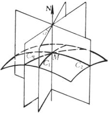 [主法截线(主方向、主曲率半径与脐点)]   通过曲面上一点M的法线的平面与曲面的交线()都称为点M的法截线。所以通过曲面上一点的法截线有无穷多条,给定点M的一个切线方向就有一条确定的法截线。在点M的法截线中曲率最大和最小的两条分别记为,它们称为主法截线,在点M所对应的切线方向称为主方向,这两个方向互相垂直。的曲率半径()称为主曲率半径,它们等于下列方程的两个根: