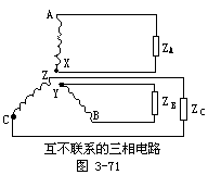 【三相电源绕组的连接法】 对于三相交流发电机所发出的三相电必须采取适当的连接方法才能发挥三相交流电的功效。如果把三相发电机的每一相都用两根导线分别和负载相连,如图3-71所示,则每一相均不与另外两个相发生关系。这样使用的三相电路称为互不联系的三相电路,它总共需要六根导线来输送电能。这与单相制比较,既不节约导线,也没有任何优越之处,在实际应用中并不采取这种方法。常用的接法有:(1)星形接法;(2)三角形接法。