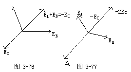 电源绕组的三角形接法和星形接法不同。在连接负载以前,三角形接法就已经构成了闭合回路。这一闭合回路的阻抗是很小的。所以三角形接法只有在作用于闭合回路的电动势之和为零时才可以。否则,在闭合回路中会有很大的电流产生,结果将使电源绕组过分发热而烧毁。三角形接法若接线正确,就能保证闭合回路中的电动势之和为零。从图3-76中可以看出,代表A相绕组和B相绕组的电动势之和的矢量