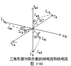 C也如此。由图3-80可知线电流的大小与相电流大小的关系为