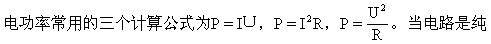 电阻,没有反电动势存在时上列各式都成立。如果电路负载中存在反电动势,则要分清此三公式的适用范围及其物理意义。若电路负载中存在反电动势,则P=IU为整个负载的总功率,而P=I2R则仅表示负载所消耗热的那部分功率。例如,当电路中接有直流电机时,如果加在电机两端电压为U,正常工作时通过电流为I。则当电枢线圈转动时作切割磁力线运动而产生感生电动势,这一感生电动势和外加电压方向相反,因
