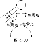 【光的散射】当光通过不均匀媒质悬浮的颗粒或分子时,部分光束将偏离原来方向而分散到各个不同方向去,称之为光的散射。如太阳光束射到地球表面时必须穿过大气层,因此阳光要受到空气分子和悬浮在空中的细小的尘埃粒子的散射。散射光的强度和光波长的四次方成反比,也就是说,波长越短的光,越多地被散射。阳光经过大气层时,其短波部分,如兰光和紫光较多地被散射掉,透过大气层而射到地面上的阳光中波长较长的黄光和红光的成分更多一些。所以没有射向地面而从空中穿过的阳光,它的兰紫色部分被散射到地面。如图4-33所示而使天空呈现蓝色。旭日和夕阳呈红色。这是因为早晚阳光以很大的倾角穿过大气层,经历的大气层要远比中午时厚得多,所以波长较短的蓝光、紫光等几乎全部被散射掉。而剩下波长较长的黄光和红光到达观察者。
