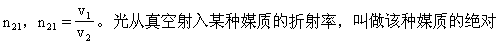 第一媒质)的折射率称为这媒质的“绝对折射率”,简称“折射率”。由于光在真空中传播的速度最大,故其他媒质的折射率都大于1。同一媒质对不同波长的光,具有不同的折射率;在对可见光为透明的媒质内,折射率常随波长的减小而增大,即红光的折射率最小,紫光的折射率最大。通常所说某物体的折射率数值多少(例如水为1.33,玻璃按成分不同而为1.5~1.9),是指对钠黄光(波长5893×10-10米)而言的。