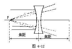 【凹透镜】 两侧面均为球面或一侧是球面另一侧是平面的透明体,中间部分较薄,称为四透镜。分为双凹、平凹及凸凹透镜三种,如图4-11a所示之A、B、C。其两面曲率中心之连线图4-11b所示之G1H,称为主轴,其中央之点O称为光心。通过光心的光线,无论来自何方均不折射。图4-11c表示,平行主轴之光束,照于凹透镜上折射后向四方发散,逆其发散方向的延长线,则均会于与光源同侧之一点F,其折射光线恰如从F点发出,此点称为虚焦点。在透镜两侧各有一个。凹透镜又称为发散透镜。四透镜的焦距,如图4-12所示。是指由焦点到透镜中心的距离。透镜的球面曲率半径越大其焦距越长,如为薄透镜,则其两侧之焦距相等。
