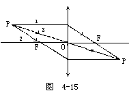 【物像公式】 描述物像位置以及它们和透镜或透镜组的特征量之一(焦距)之间的关系式。对一个薄凸透镜可以认为是由底面朝向透镜中央的许多棱镜的集合,而这些棱镜的顶角是很小的,对于顶角很小的棱镜来说,如果构成棱镜的材料的折射率为n,顶角为A,那么在近轴光线的条件下,其偏向角δ为常数(n-1)A。当棱镜给定后,近轴光线的偏向角δ是不变的。我们可以利用此关系来推导薄透镜的物像公式。如图4-13a所示,设PM为平行光束所任一条光线在M点入射,而OM=h,则出射光线MF′必通过透镜的焦点F′,OF′=f,f为透镜的焦距。根据近轴光线的条件,即f>>h,偏向角近似为
