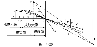 【凸透镜】 凸透镜是中央部分较厚的透镜。凸透镜分为双凸、平凸和凹凸(或正弯月形)等形式,如图4-9所示。薄凸透镜有会聚作用故又称聚光透镜,较厚的凸透镜则有望远、发散或会聚等作用,这与透镜的厚度有关。将平行光线(如阳光)平行于轴(凸透镜两个球面的球心的连线称为此透镜的主光轴)射入凸透镜,光在透镜的两面经过两次折射后,集中在轴上的一点,此点叫做凸透镜的焦点(记号为F),凸透镜在镜的两侧各有一焦点,如为薄透镜时,此两焦点至透镜中心的距离大致相等。凸透镜之焦距如图4-10所示,是指焦点到透镜中心的距离,通常以f表示。凸透镜球面半径越小,焦距越短,凸透镜可用于放大镜、老花眼及远视的人戴的眼镜、显微镜、望远镜的透镜等。