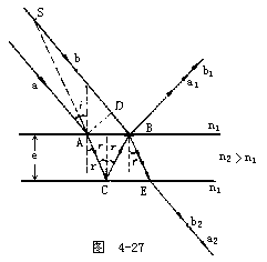 【薄膜干涉】水面上的薄层油膜,机动车在潮湿柏油道上所遗留下来的油迹,或是肥皂泡等,都会在白光中出现灿烂的彩色。所有上述的各例中,均是由薄膜干涉现象引起的。若将一用金属细丝制成的矩形框架,浸以肥皂水形成一层薄膜,然后用弧光灯的白光或阳光照射于其上,就呈现出典型的薄膜干涉。其中一部分是由反射光产生的干涉条纹,而其余的则从皂液膜中透过去。此时从反射光中可以看到许多与水平框架上缘平行的彩色横条纹。不但如此,这些横条纹还会慢慢地向下移动,愈靠近框架上缘则愈宽。此外,透射光在白幕上也显示出许多彩色横条纹,但比起反射光中的条纹要暗淡得多。如果用单色光代替白光,则彩色现象会立即消失,而出现的便是一些彩色条纹的花样类似于明暗相间的条纹。在1800年英国科学家杨格指出薄膜彩色条纹之形成,是因为干涉现象所致。如图4-26,SA是一束单色光,斜射到厚度为d之皂液薄膜P1P2上。照射于A处之光线S(实际上它代表的是一个光束),一部分立即被反射,而另一部分则折射到B处。反射部分以S1来表示,折射至B处者又会照样地有一部分立即被反射,及另一部分被折射。后者仍用S3来表示。被反射的光线抵达C处,又在该处分为两部分,一部分折射为平行于S1之S2,另一部分被反射后则沿CD路线而抵达D处。然后再在该处被分为两部分,一部分折射为平行于S3之S4,另一部分则被反射到E处。关于薄膜上所发生之干涉现象(单色光),如果有两条平行入射到薄膜上,如图4-27中的a和b,b在薄膜上表面的反射光线为b1,a由膜的上表面折射到下表面的C点再反射到B点,又折回a1与b1重合。我们可以计算出aa1和bb1之间的光程差。对薄膜来说,AB的长度比光源S到薄膜的距离小得很多,因此∠BSA非常小,可以认为SA和SB是相互平行的。作AD⊥SB,可以认为SA=SD,也就是说从S发出的这两条光线分别到达A点和D点时,光程是相等的。从图中可以看出,光线a在薄膜(折射率为n2)中经历路程ACB到达B点,而光线b在原媒质(折射率n1<n2)中经历路程DB而在B点反射。所以这两光线之间的光程差