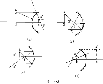 【球面镜成像】 对于凸面镜只能使特成正立、缩小的虚像。如图4-2(a)所示。由物A点出发的平行于光轴的光线,达到镜面后将反射,其反射光的延长线必交球面镜的焦点F上。而从A射向F的光线被球面反射后将平行于光轴。这两条反射线,没有实交点,只有虚交点A′,也就是说视觉认为这两条光线是从A′发出的。物体上的B点发出的沿光轴的光线,即平行于光轴,又过焦点,故B′为B点的像。在物体AB上的各点,接照前述办法作图,其各点的像点都在A′B′上,故A′B′即为AB的像。无论物AB在何处,它所发出的光射到球面镜后而反射的光,没有实交点,因此所成之像必为虚像。由图中可以看出,物体在轴的上方,所成的虚像也在轴的上方,故所成之像为正立。无论AB在什么位置,从A点出发的平行于轴的光线一定在AF方向的光线的上方。此两线的交点A′必比A点更靠近轴,所以像是缩小的。根据上述方法作图可知凹透镜成像可有三种情况:(1)物在凹镜前二倍焦距以外时,是倒立缩小的实像,见图4-2(b)。(2)物在两倍焦距以内,焦点以外时,则成倒立放大的实像,见图4-2(c)。(3)当物位于焦点以内时,则成正立的放大的虚像,见图4-2(c)。