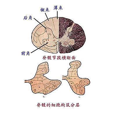 (1)前角:含有前角运动神经元,发出运动纤维,参与前根的组成。 (1) before the horn: Contains anterior horn motor neurons, issuing motor fibers, consisting of pre-roots participation.